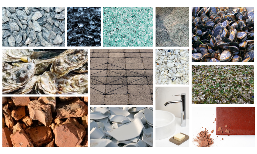 Pour la fabrication de ses produits, Wasterial® utilise des matériaux tels que la porcelaine, les coquilles de moules et d’huîtres, le sable de fonderie, la brique, le verre de bouteilles, le verre bleu, et la pierre bleue.