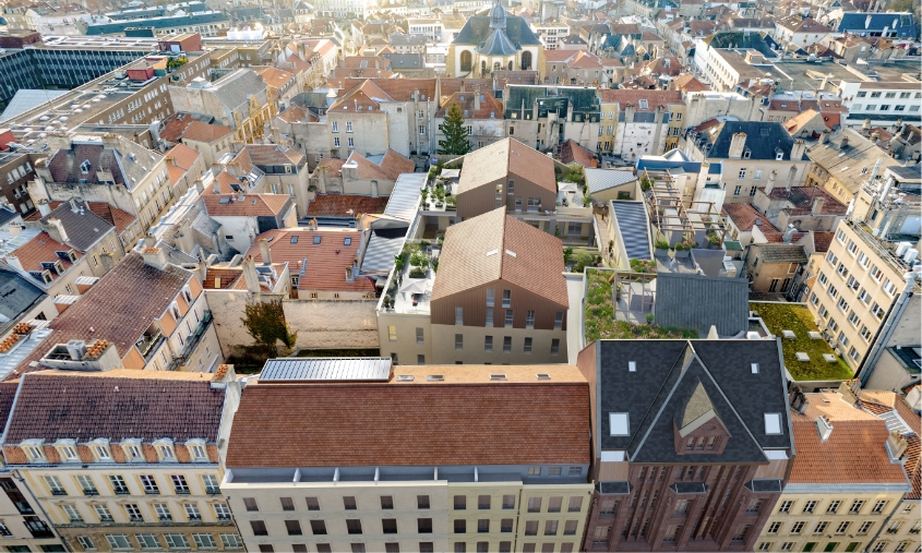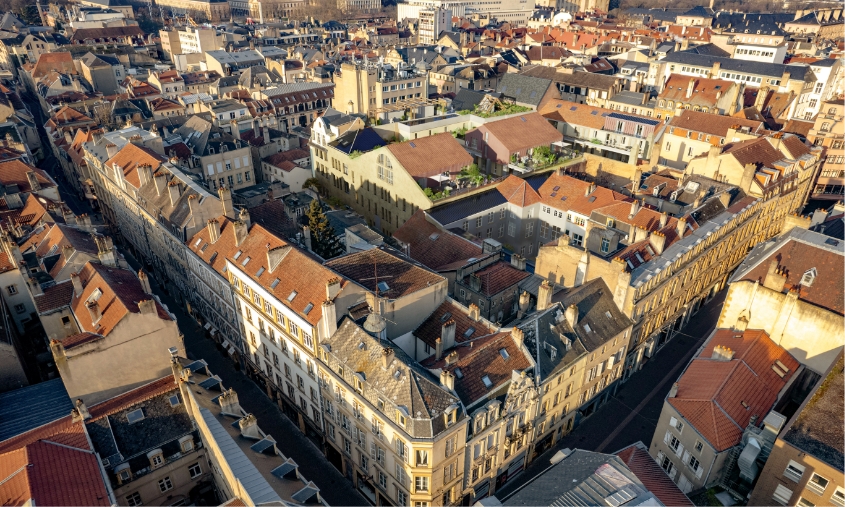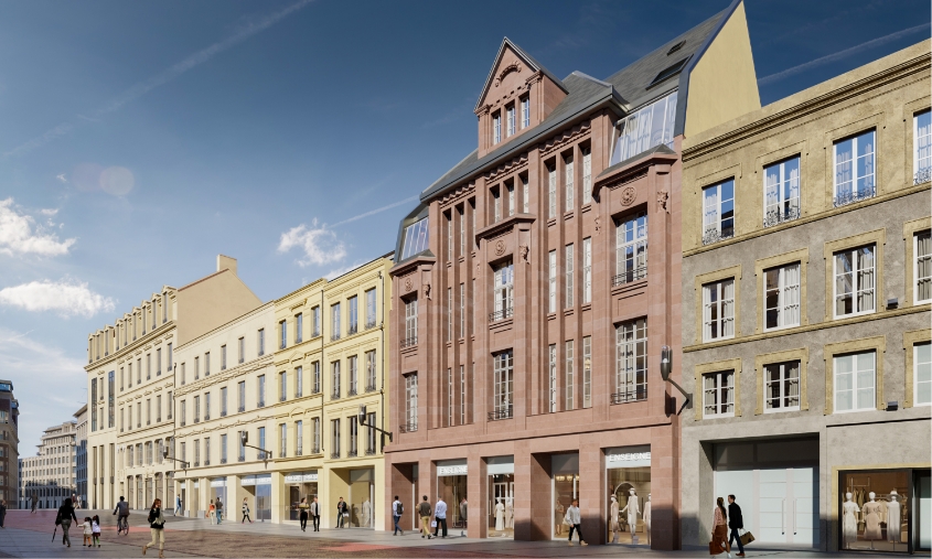 Partie intégrante du patrimoine messin, le bâtiment iconique et emblématique abritait jusqu’alors l’enseigne Le Printemps. Son emplacement est exceptionnel et sa façade remarquable en grès des Vosges et pierre de Jaumont est préservée et restaurée. Le projet s’adapte aux usages et attentes des futures habitants tout en revalorisant le patrimoine ancien et les savoir-faire existants pour offrir des appartements de demain, plus durables et responsables. Un programme diversifié qui garantit la mixité des usages des futurs habitants. La création de jardins et la mise en place de logements qualitatifs répond aux besoins des populations locales.
